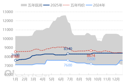 2025年中國酯基生物柴油產(chǎn)品價格波動在7600-8400元/噸,振幅11%。年度價格高點在9月,低點在1月。年均價格在8214元/噸,較于2024年的年度價格7285元/噸,上漲929元/噸,漲幅達12.75%。